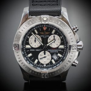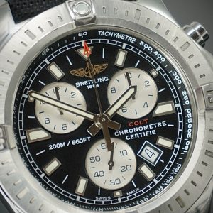 Breitling Colt Chronograph A7338811/BD43 – 44mm stainless steel case, black dial, Uni-directional rotating bezel, scratch-resistant sapphire crystal. Powered by Breitling Calibre 73 Super Quartz movement. Comes with original box & papers.