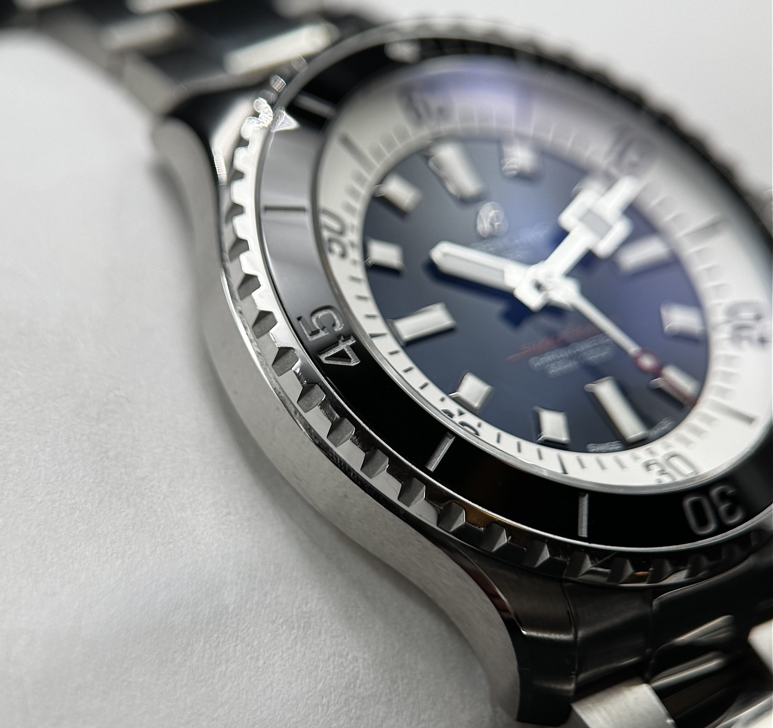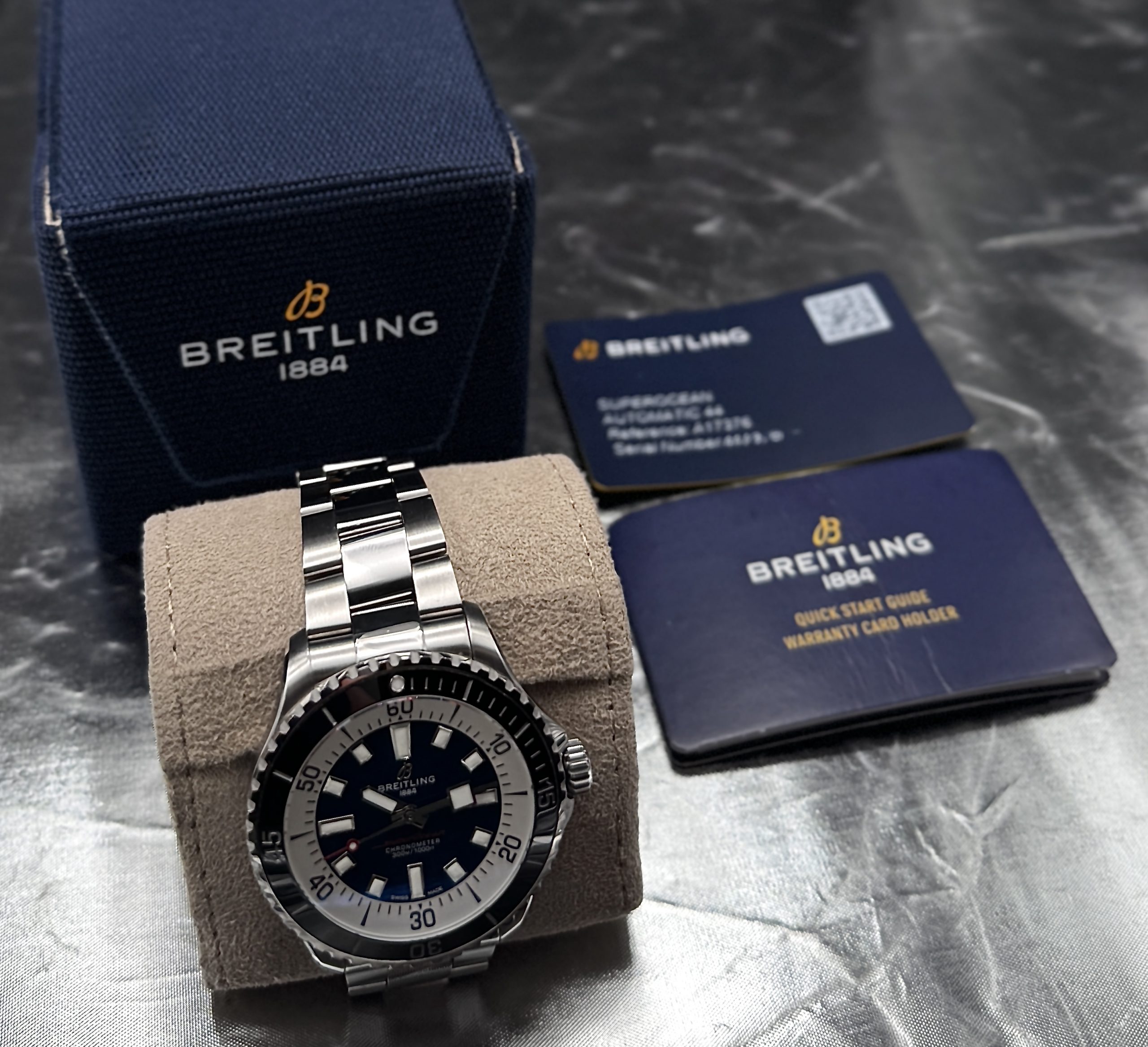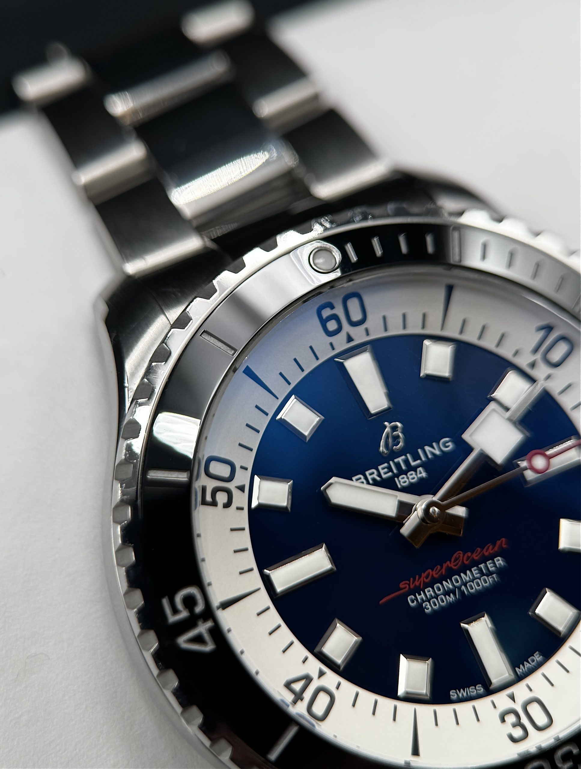 Built for serious water use yet refined enough for everyday wear, the Breitling Superocean Automatic 46 delivers exceptional durability, precision, and legibility in any environment. Its COSC-certified automatic movement ensures reliable timekeeping you can trust, while the bold, highly luminous dial makes reading the time effortless above or below the surface. The robust stainless-steel case and ceramic bezel are designed to withstand active lifestyles without sacrificing style. With 300 meters of water resistance, this watch offers true dive-ready performance that transitions seamlessly from ocean to office.