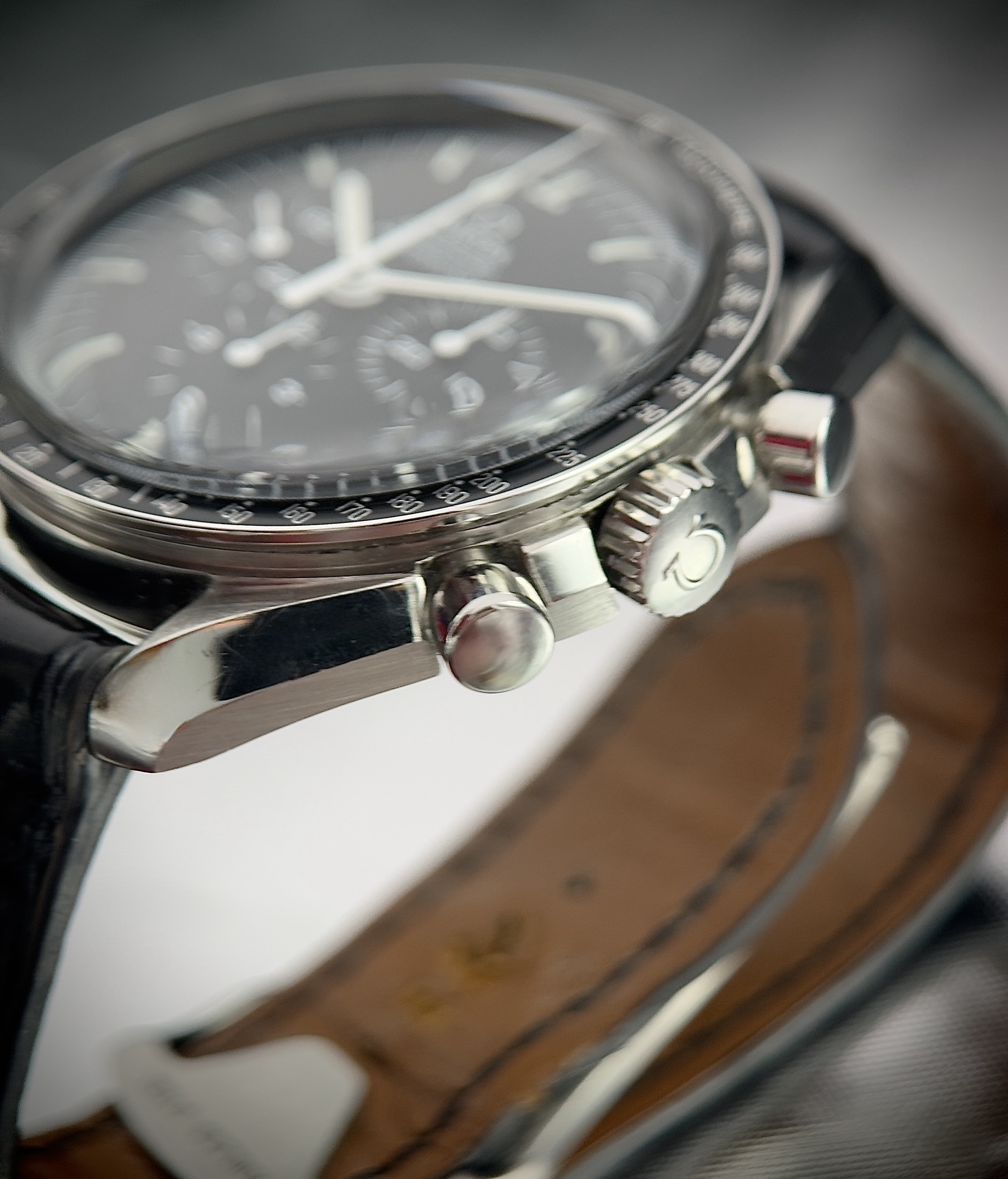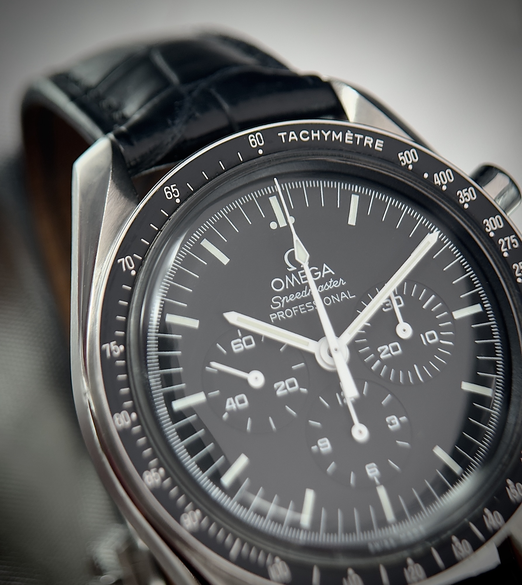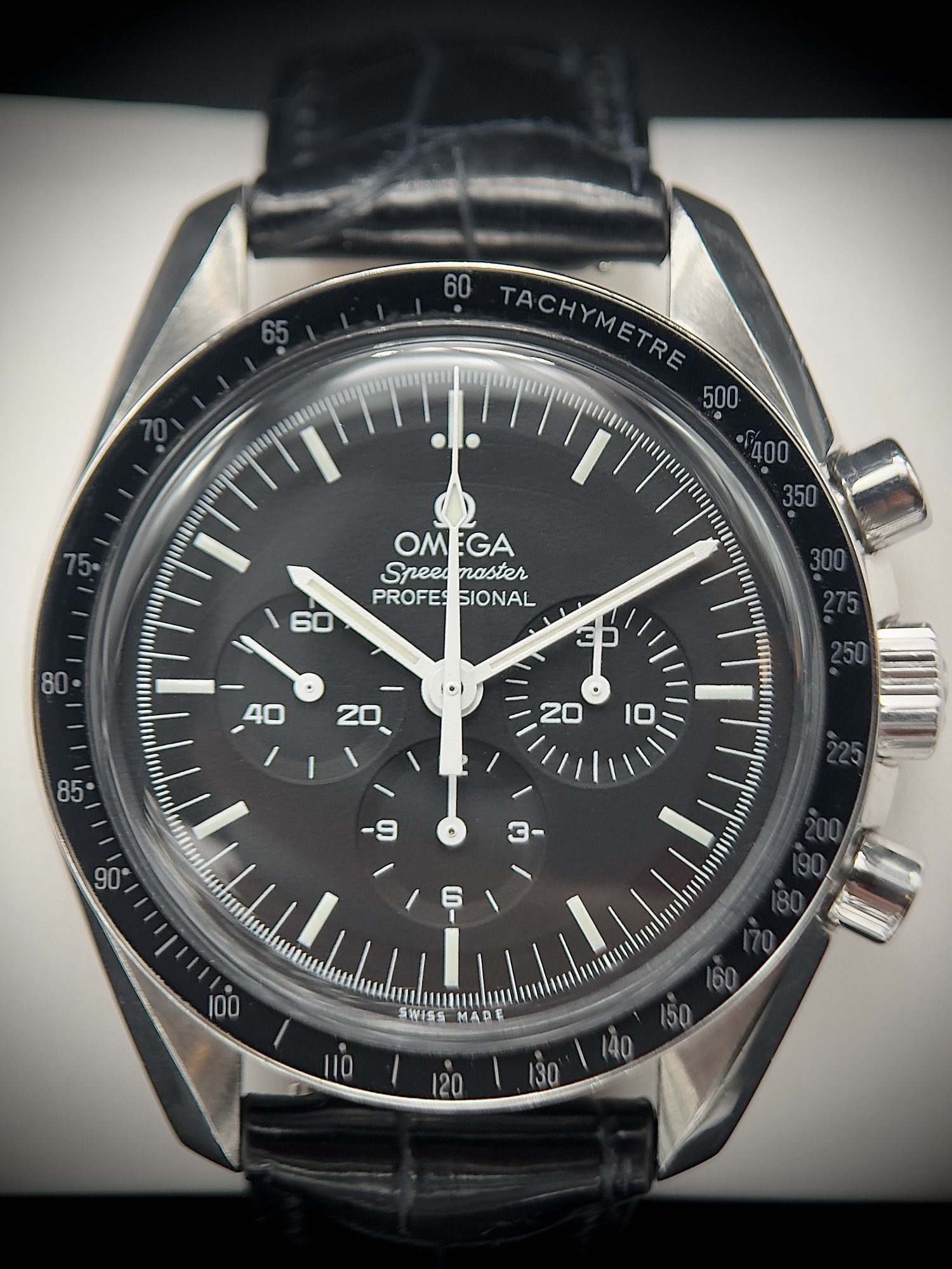 • Fixed black tachymeter bezel for speed calculations — signature Speedmaster trait