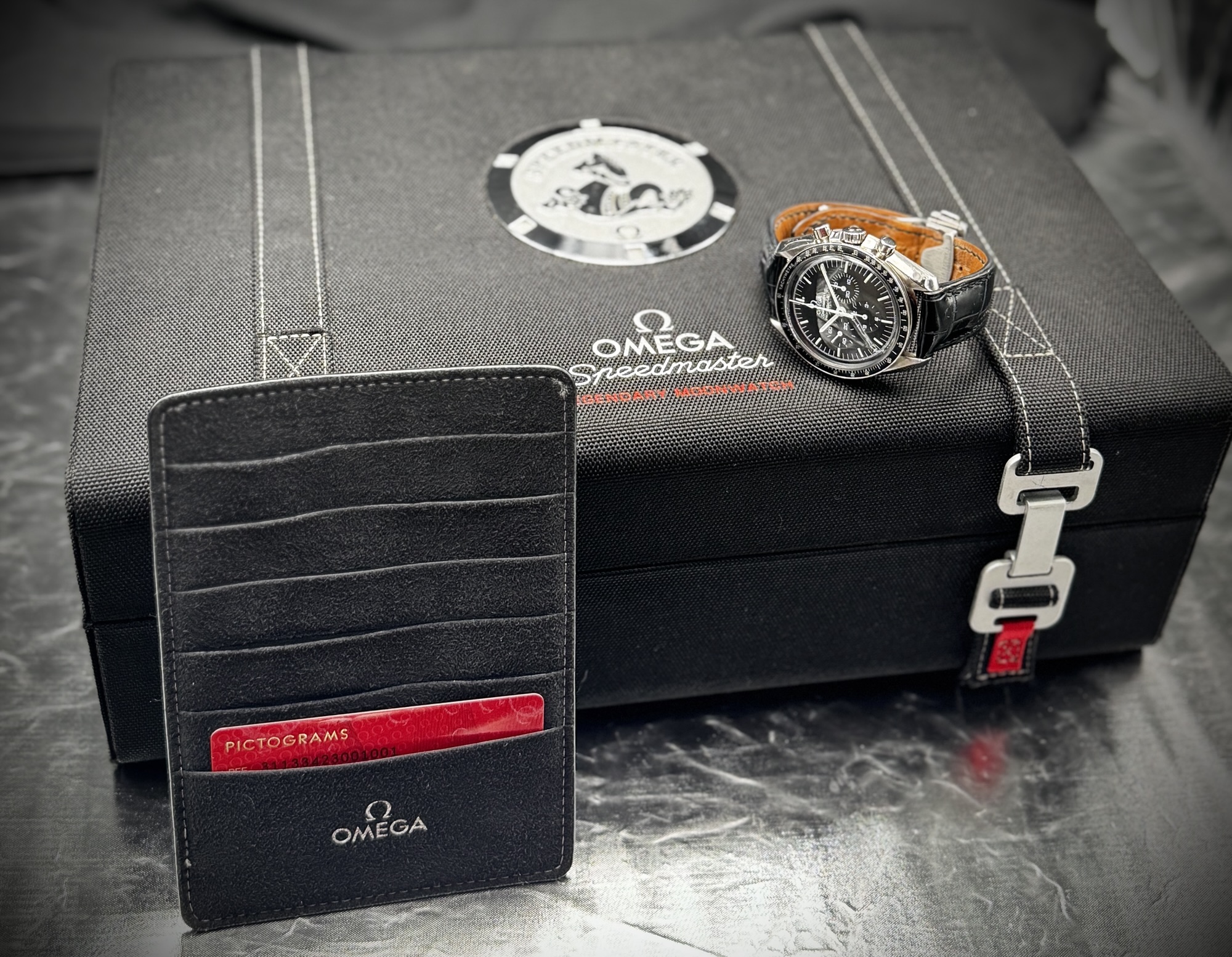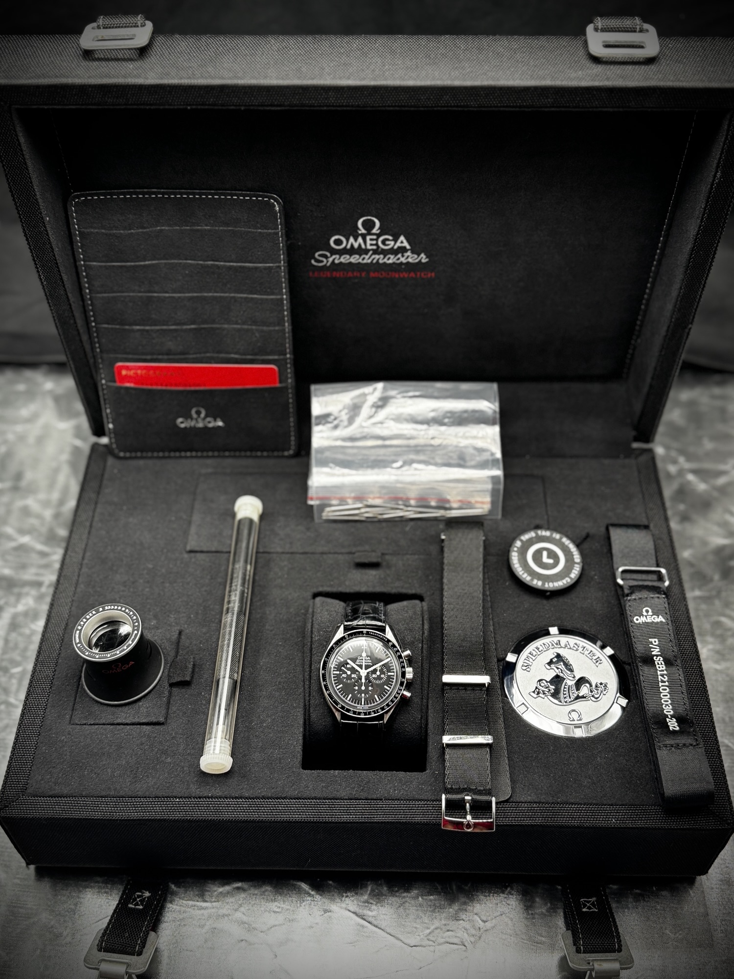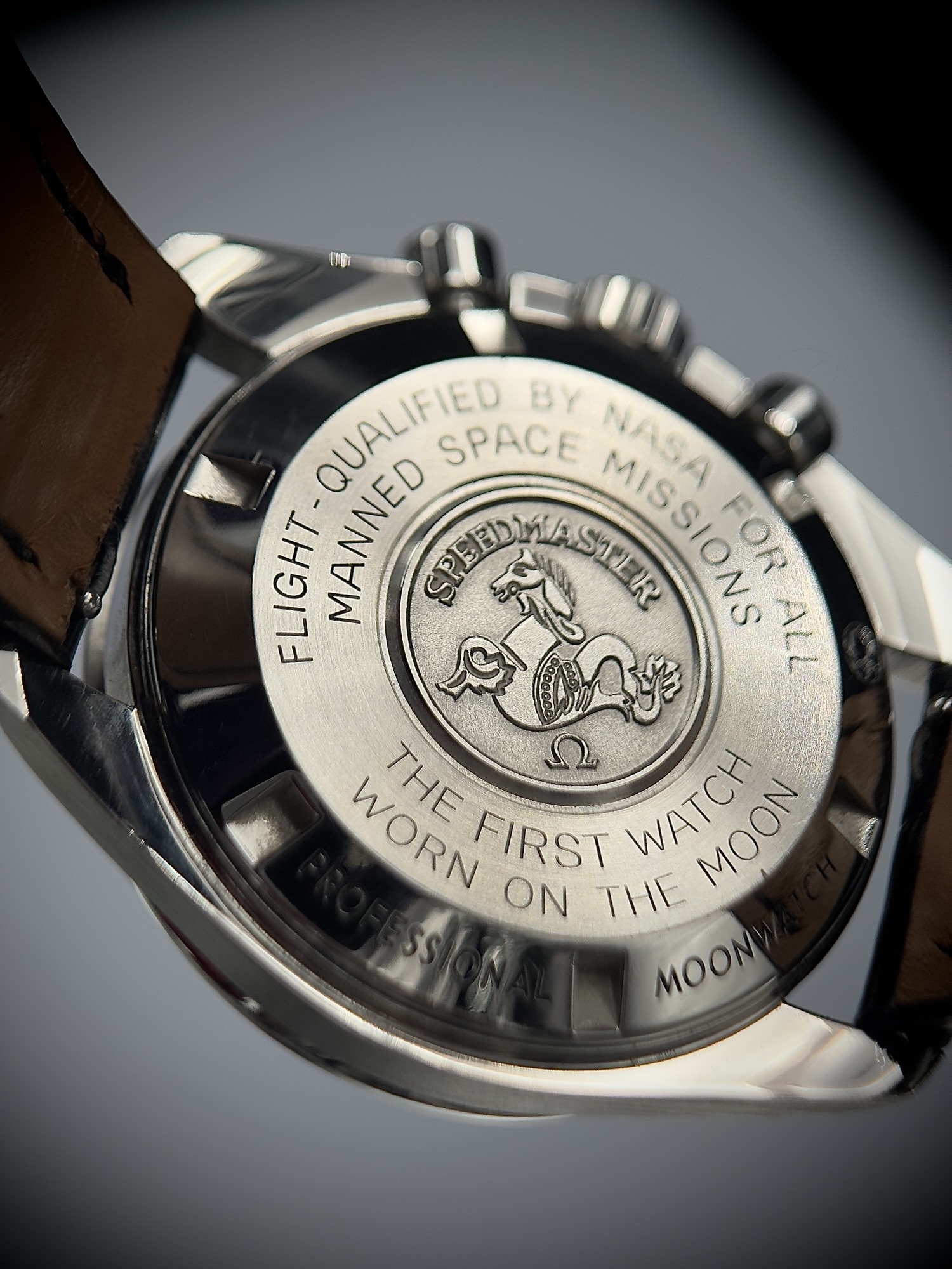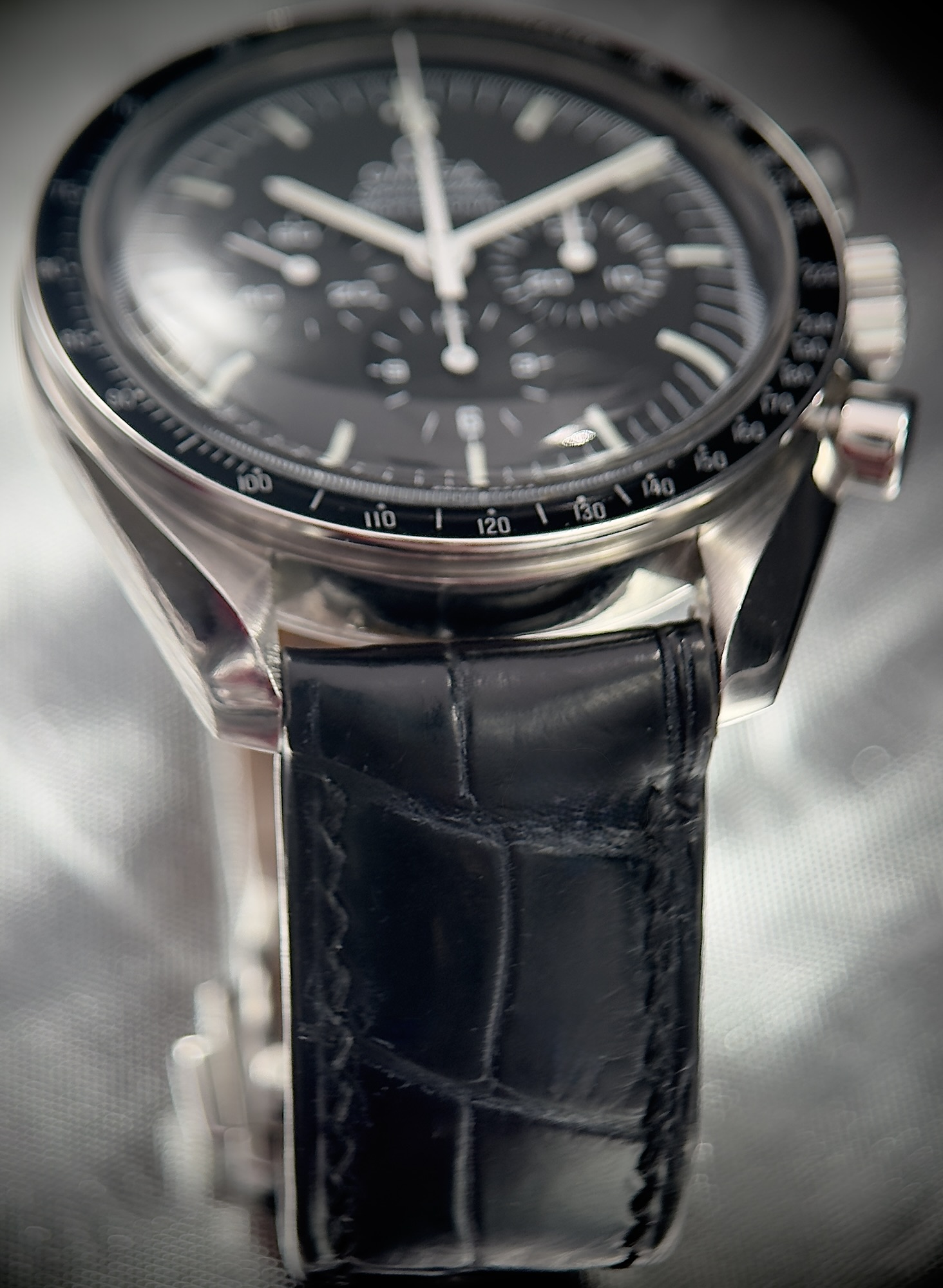• Fixed black tachymeter bezel for speed calculations — signature Speedmaster trait