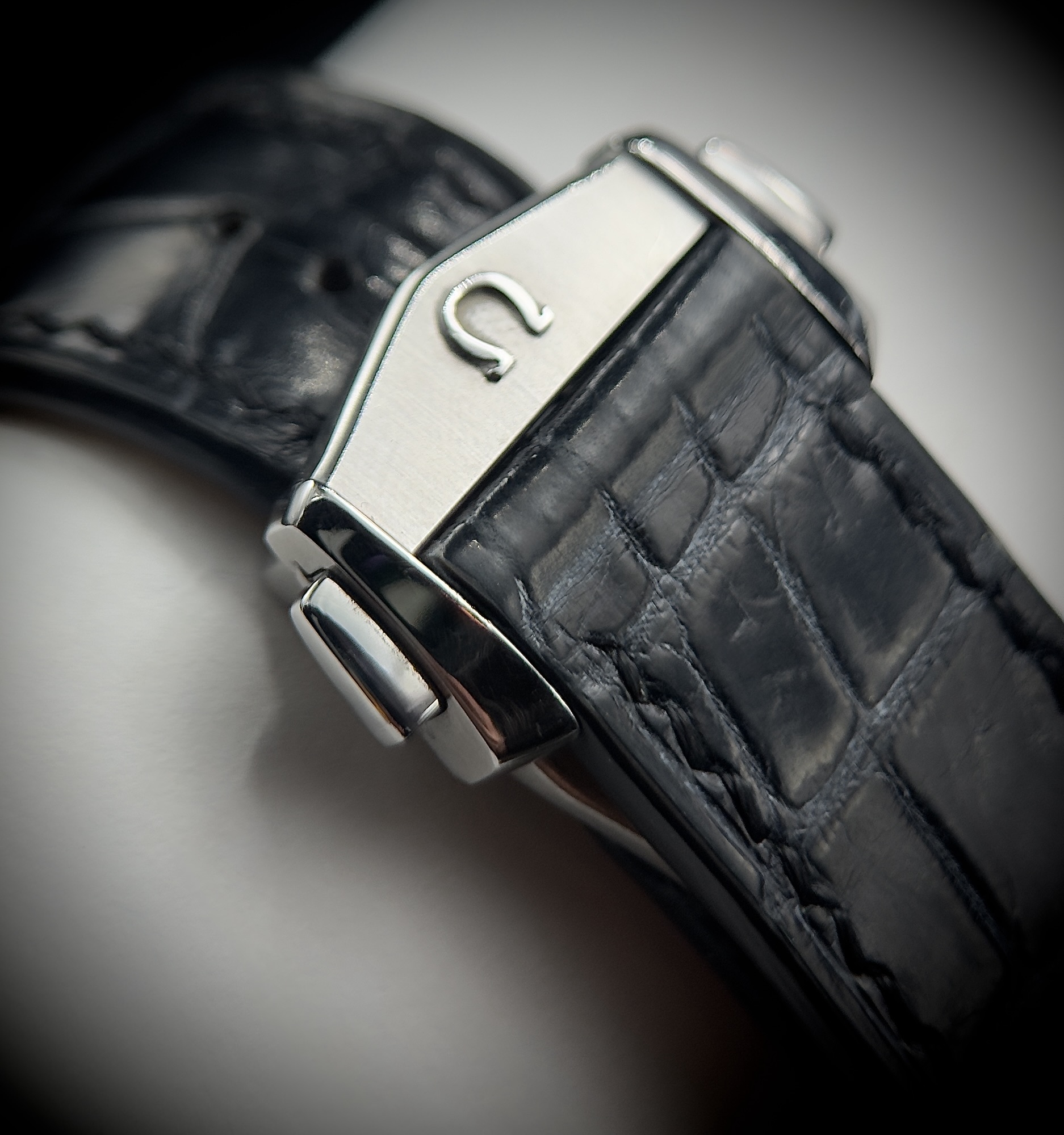• Elegant black leather strap (often alligator pattern) with a deployant clasp for secure, comfortable wear