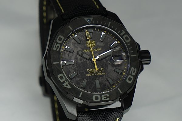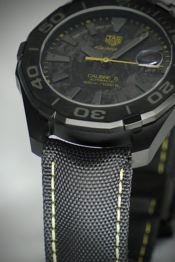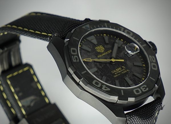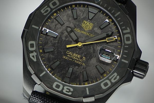 - Dial: Carbon‐effect black dial (i.e., textured carbon look) with contrasting elements (in this model often yellow accents) and highly legible indices/hands